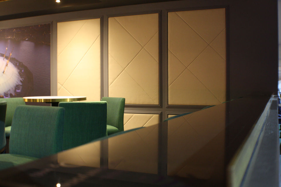 The white Corian-topped bar tables are edged with metallic brass, to complement the brass panel on the bar, and to contrast with the furniture. The bar at the back of the suite is a bespoke piece, with a drinks ledge that gives a clean and tidy finish, and keeps the clutter of the bar out of sight of customers. It has a mesh brass panel stretching across the front, adding texture and a contrasting visual experience. Again, the brass contrasts with the black worktop and adds another hint of luxury.