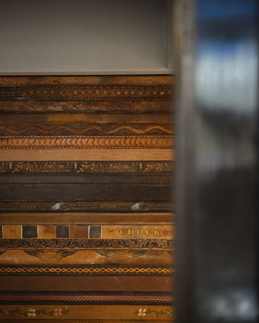 Along with a Chesterfield sofa, chemist's counter and belt wall, a vintage cocktail bar has been installed to add some timeless style to this space. The belt wall is constructed from second-hand leather belts, attached to a panel and hung in the stairwell. The space is intended to provide an experience for its customers every day, as well being a venue for the perfect cut & shave before a big night out, or special occasion.